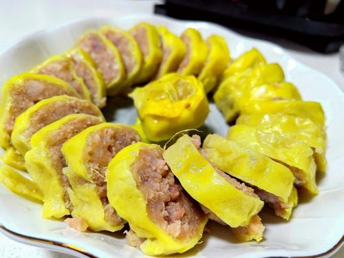 值得注意的是,這道美食用的豬肉全是新鮮的,從不用凍豬肉。還有淀粉的量也有標準,放多了不好吃,放少了不成團。雞蛋皮是用雞蛋和玉米淀粉和成漿做成的,在平底鍋上一攤一搖,一張薄如蟬翼的雞蛋皮就完成了。周紅衛說,一天可以做二三百張雞蛋皮,然后用刀將其切成兩半。半張皮能包近300克肉,可以說皮薄肉多。