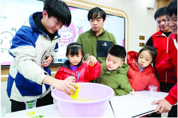 隨后,精彩的科學實驗秀登場了。首先是“火山爆發(fā)”實驗。一個大姐姐在一個杯子里倒入白醋,再加入不同顏色的色素及洗潔精,最后將小蘇打倒入杯中。一瞬間,杯子里產生了大量的彩色泡泡,一下涌出杯口,就像火山爆發(fā)一樣。大家看了紛紛稱奇,大姐姐揭開了謎底,原來這是小蘇打和白醋產生二氧化碳氣體導致的。