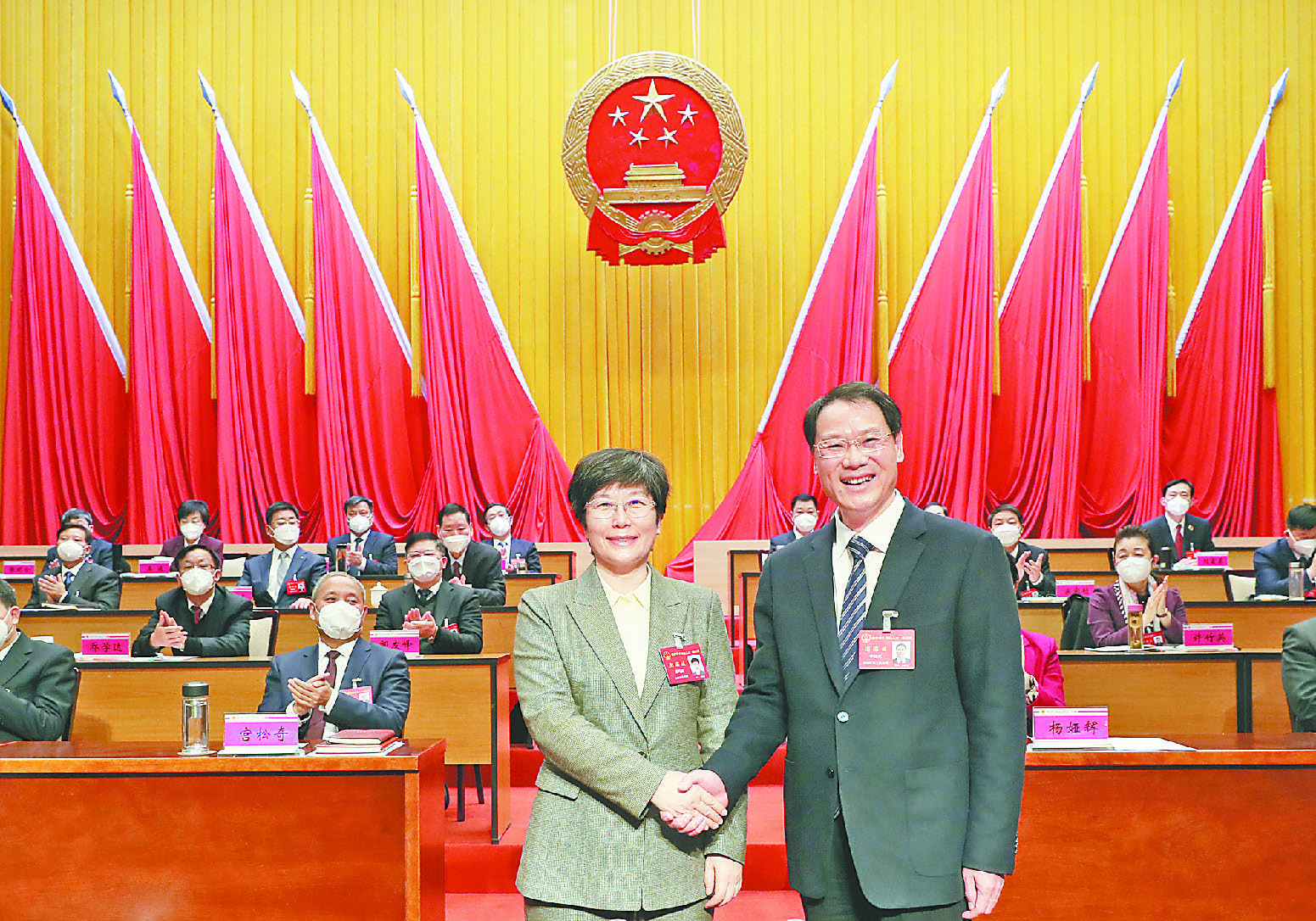 市委書記葛巧紅與新當選的焦作市人民政府市長李亦博握手表示祝賀。