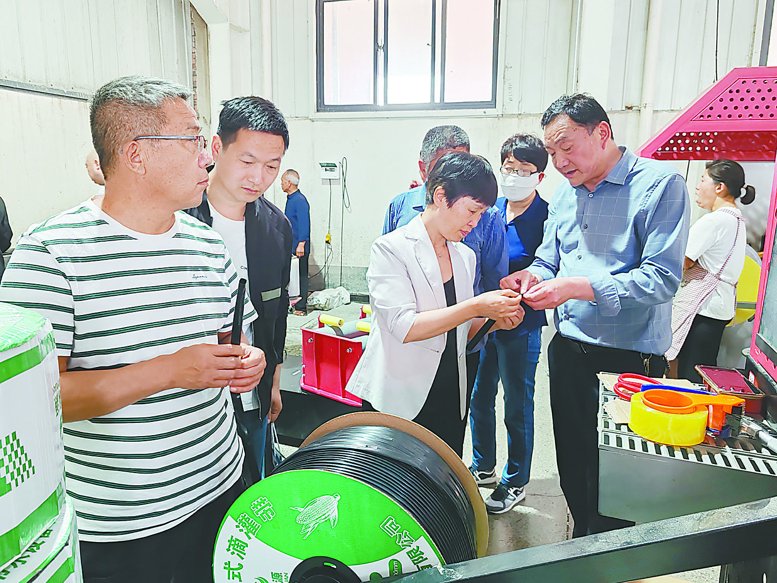 4月26日,農業農村部玉米單產提升工程專家指導組副組長謝瑞芝(前右二)和種植大戶參觀滴灌帶生產車間。