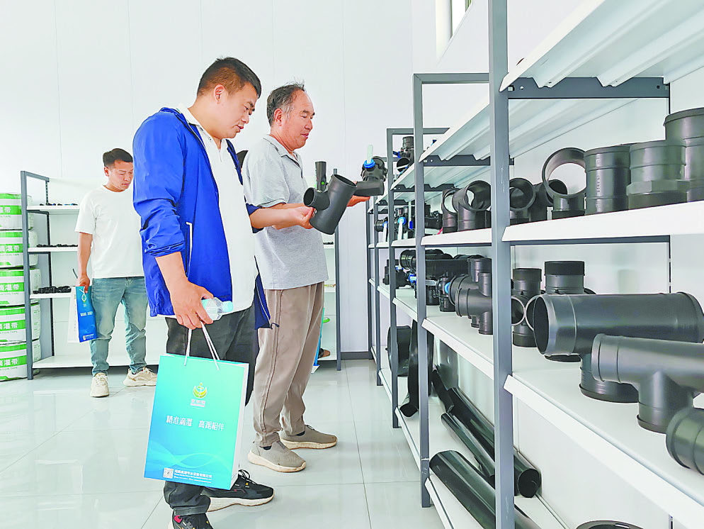 4月26日,在武陟縣喬廟鎮的河南高湖節水設備有限公司展廳,種植大戶認真了解滴灌帶配套產品。