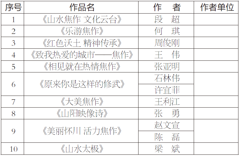 2024年3月20日至2024年7月31日,我市面向全國公開征集“一句話品讀焦作、一首歌唱響焦作、一條視頻愛上焦作”“三個一”優(yōu)秀作品評選活動,共征集到“一句話品讀焦作”作品10889件,“一首歌唱響焦作”作品156首,“一條視頻愛上焦作”作品500件。按照評選流程,經(jīng)專家評審團初步評選、網(wǎng)絡投票、最終評審,現(xiàn)將最終評選結果公告如下: