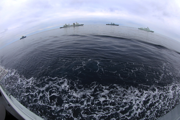 在日本海某海域進行的“北部·聯(lián)合-2023”演習中,中俄雙方艦艇編隊航行(2023年7月20日攝)。新華社發(fā)(張海龍 攝)