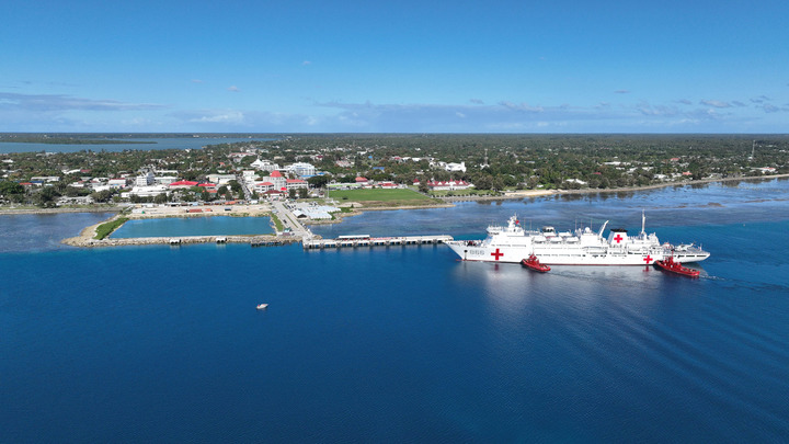 2023年7月28日,執(zhí)行“和諧使命-2023”任務的中國海軍“和平方舟”號醫(yī)院船抵達湯加王國努庫阿洛法港(無人機照片)。新華社發(fā)(桂江波 攝)