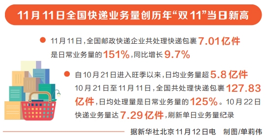 本報訊(記者 胡舒彤)11月12日,記者從省郵政管理局獲悉,11月11日,全省郵政快遞業攬收快遞包裹3346萬件,同比增長16.7%;投遞快遞包裹2757萬件,同比增長21.8%。