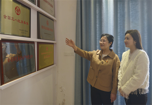 山陽區藝新街道冬香好媽媽工作站黨支部書記張冬香為記者介紹該站所獲得的榮譽。