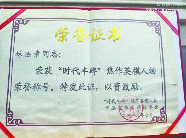 2016年7月,林法章榮獲“時代豐碑”焦作英模人物證書。