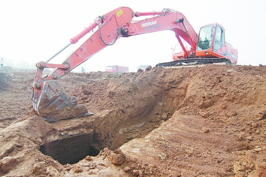 7月27日,一市民向記者報料:南水北調焦作段蘇藺村境內發(fā)現(xiàn)一座古墓葬。記者遂即向市文物工作隊反饋了這一情況。市文物工作隊立即派出工作人員進入施工現(xiàn)場,對古墓葬展開先期保護。昨日一早,記者在發(fā)掘現(xiàn)場看到,文物工作人員指揮一輛鏟車鏟去古墓券頂后,又指揮工人用鐵釬鏟去浮土,古墓葬的墓室已完全露出。市文物工作隊考古部主任劉勇稱:“為了不影響南水北調工程的施工進度,我們對古墓葬進行了搶救性發(fā)掘,在對其進行大開挖后,我們會派專業(yè)人員進入墓室發(fā)掘文物。”
