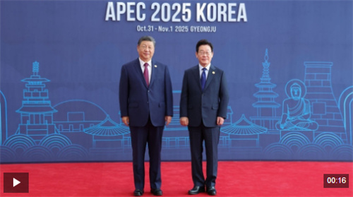 習近平主席抵達時,韓國總統李在明熱情迎接。兩國元首握手、合影,留下珍貴的“APEC瞬間”。隨后,兩位領導人微笑交談,共同步入會場。