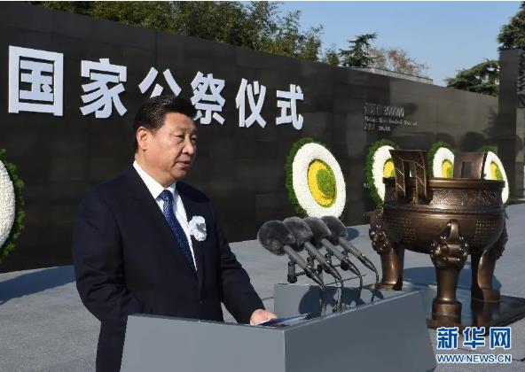 2014年12月13日上午,中共中央、全國人大常委會、國務院、全國政協、中央軍委在南京隆重舉行南京大屠殺死難者國家公祭儀式。中共中央總書記、國家主席、中央軍委主席習近平出席并發表重要講話。新華社記者 李學仁 攝