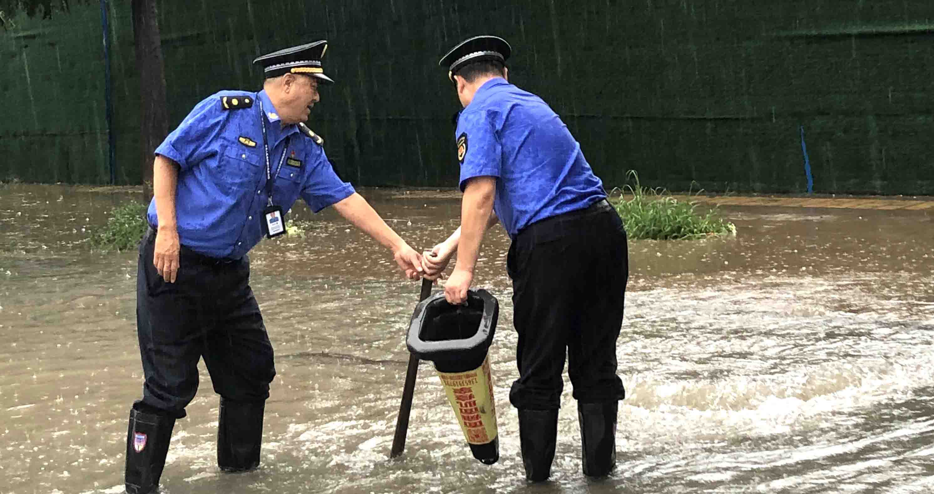 該所防汛隊員在白天的巡查中發(fā)現(xiàn),新園路西段一連8個窨井蓋被雨水沖開。為了確保車輛和行人的安全,防汛人員一邊聯(lián)系相關(guān)產(chǎn)權(quán)單位,一邊動手進(jìn)行處理,保障行人的安全。“雖然我們只有監(jiān)管的責(zé)任,但在非常時期,人民至上,生命至上,我們必須義無反顧參與搶險。”王慧芳說。