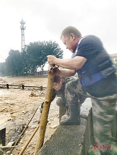 當天13時許,從救援一線急匆匆趕回來的張喜瑞終于見到被轉移出來的父母。老母親嚇得渾身發抖,哆嗦著話也說不清,一直重復著“家進水了,家進水了”!皨,別害怕,有我在,有咱們這么多一線抗洪的同志在,咱村沒事的。”張喜瑞紅著眼說。