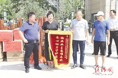 劉淑華(左二)收到業主們代表送來的錦旗。