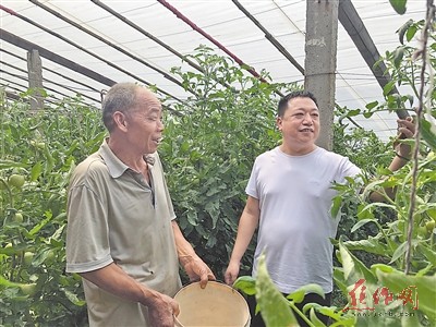 圖① 賈佳佳(右)在村民的蔬菜大棚里了解情況。