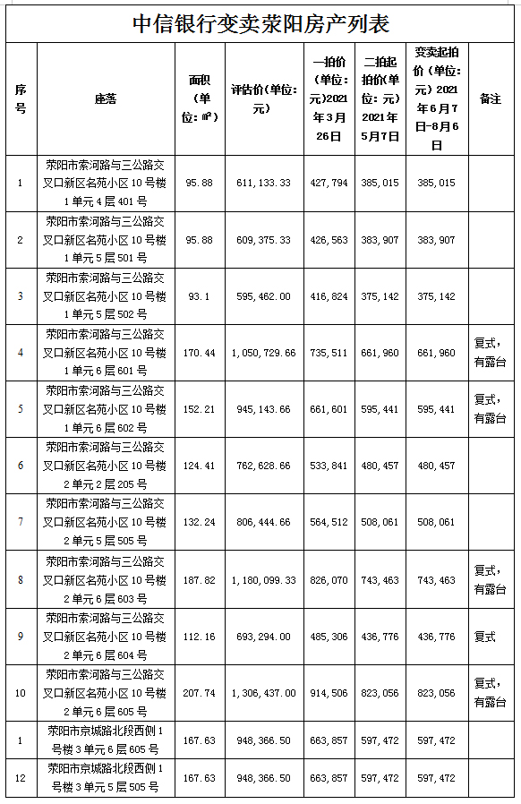 中信銀行鄭州分行在法院申請執(zhí)行河南某公司過程中查封了該公司名下30套房產(chǎn),現(xiàn)批量變賣處置該查封房產(chǎn)。鄭州市中級人民法院將于2021年6月7日-8月6日依法強制變賣上述12套房產(chǎn)(前期已拍出18套),該批量房產(chǎn)分別位于滎陽市索河路三公路交叉口聯(lián)合新區(qū)名苑小區(qū)(10套)和京城路北段檢察院家屬院(2套)。批量變賣的房產(chǎn)地理位置優(yōu)越,位于滎陽市中心城區(qū),小區(qū)正對面是滎陽高中就學(xué)十分方便,生活氣息濃厚。其中聯(lián)合新區(qū)名苑小區(qū)房齡較新,房產(chǎn)建筑面積從90多平到200多平都有,變賣起拍單價僅四千左右,房子目前處于騰空狀態(tài),購入后即可裝修入住。