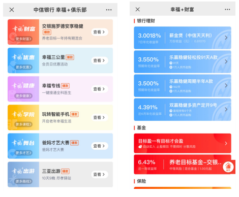 中信銀行“幸福+”是國內著名的老年金融服務品牌,包括老有所養“幸福+財富”、老有所醫“幸福+健康”、老有所享“幸福+優惠”、 老有所學“幸福+學院”、老有所游“幸福+出游”、老有所樂“幸福+舞臺”六大服務板塊,打造了慢病管理、電話家庭醫生、幸福三公里、老年課程、幸福專線、“幸福家爸媽才藝活動”等多項深受老年客戶喜愛的爆款服務和活動。