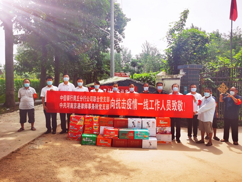 疫情防控期間,服務(wù)有溫度,更有社會(huì)責(zé)任和擔(dān)當(dāng)。8月10日,中信銀行商丘分行公司聯(lián)合黨支部同中共河南京港律師事務(wù)所黨支部一道,赴睢陽(yáng)區(qū)商都社區(qū)和梁園區(qū)孫福集鄉(xiāng)谷臺(tái)子村委會(huì),慰問(wèn)高溫酷暑下晝夜堅(jiān)守崗位的疫情防控“戰(zhàn)士”,為他們送去了急需的礦泉水、方便面,傳達(dá)了中信銀行的慰問(wèn),向疫情防控的“最美逆行者”致敬。8月17日,中信銀行商丘分行機(jī)關(guān)黨支部得知許昌援商醫(yī)療隊(duì)在新城辦事處宇航社區(qū)開(kāi)展核酸檢測(cè)工作,及時(shí)為他們送去了口罩、純凈水等抗疫物品,并派出黨員志愿者服務(wù)隊(duì)協(xié)助社區(qū)做好轄區(qū)疫情防控值班工作,緩解社區(qū)抗疫人員不足的壓力,將助力抗疫工作落到實(shí)處。