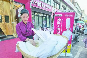 一個大竹筐,上面蓋層厚厚的白棉被,后面候著一位面帶微笑的俊俏小姑娘。旁邊豎著一個紅色廣告牌,上面寫著“新鮮羊肉包,地道手工‘小仙女’包的包子”“想買包子就找她——包子西施”,這些都成為民主南路三鍋演義門口一道亮麗的風(fēng)景線。