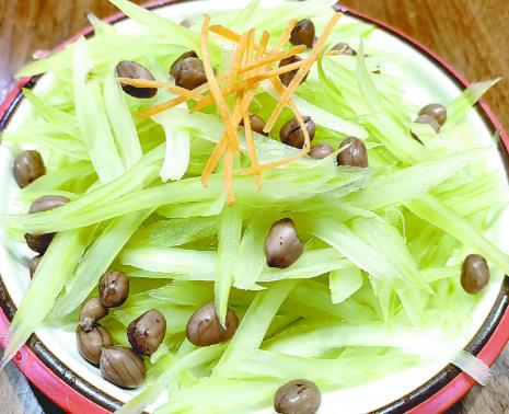 該店新推出的壓板肉拌黃瓜,黃瓜口感脆嫩、味道清淡,再佐以自制的壓板肉,葷素搭配適宜。這道涼菜無論是作為開胃菜還是配餐的一部分,都能為餐桌增添一分清新的風味。涼拌脆芹菜,入口清脆,香而不膩,芹菜還有降血脂等作用。