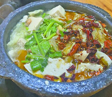 武陟砂鍋,傳承千年。制作時(shí),先將肉類食材熱鍋清水?dāng)嗌⑷ギ愇叮缓蠓湃胧⒂星逅纳板亙?nèi),旺火燒開,再用小火慢慢煨煮,湯味濃厚,肉質(zhì)酥嫩香爛。最令人驚艷的是,武陟砂鍋端上餐桌后,服務(wù)員會(huì)端著一勺剛炸好的紅辣椒油倒入砂鍋,“刺啦”一聲,刺激食客們的味蕾。