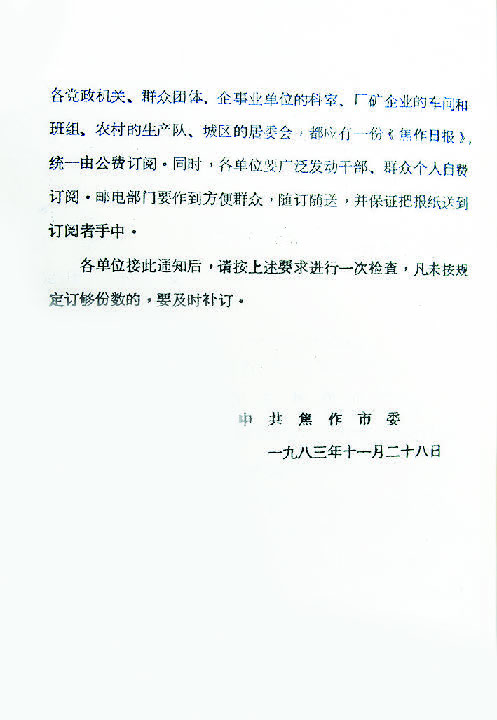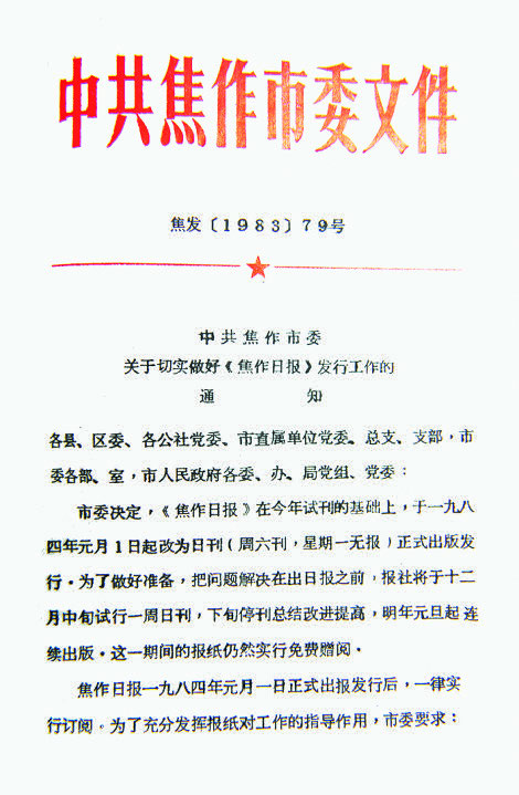 中共焦作市委關于切實做好《焦作日報》發行工作的通知。
