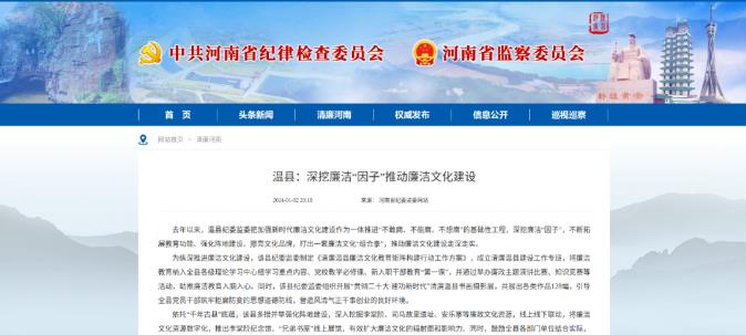去年以來,溫縣紀委監委把加強新時代廉潔文化建設作為一體推進“不敢腐、不能腐、不想腐”的基礎性工程,深挖廉潔“因子”,不斷拓展教育功能、強化陣地建設、擦亮文化品牌,打出一套廉潔文化“組合拳”,推動廉潔文化建設走深走實。
